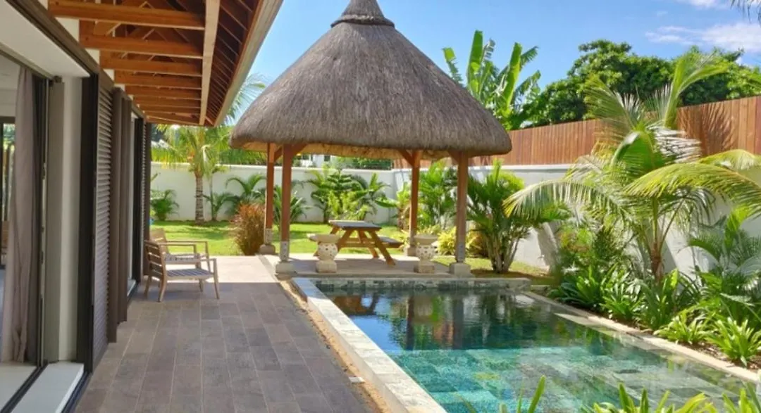 Die Elegant Villa in Pereybere, Grand Baie + Pool hat einen Blick auf den Garten. Die Badezimmer in der Unterkunft sind mit einer getrennten Toilette und einer Dusche ausgestattet. Die Bäder verfügen auch über Badelaken für zusätzlichen Komfort.